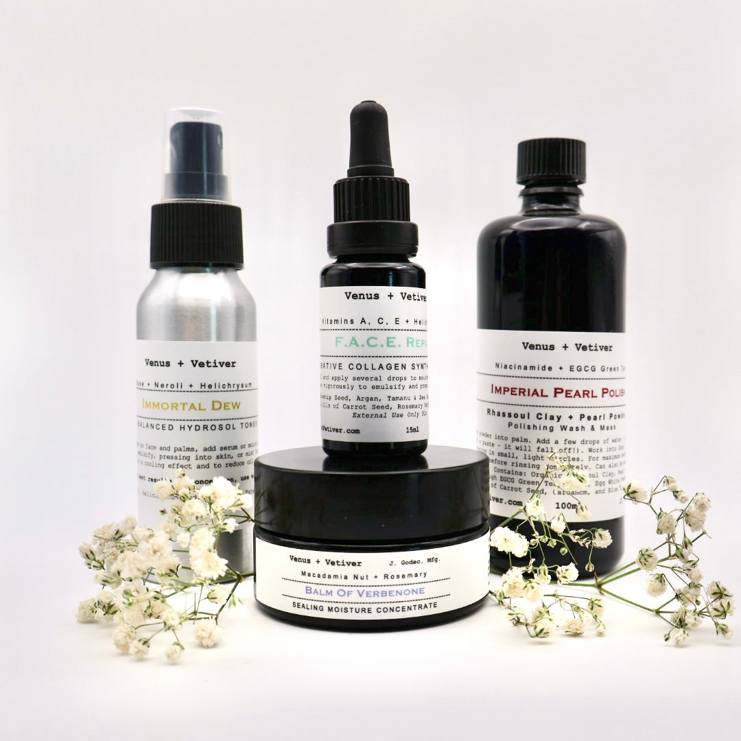 This thoughtfully assembled kit includes Imperial Pearl Powder Wash, F.A.C.E. Repair or Carrot Seed Serum, Immortal Dew pH Balancing Hydrosol, and Balm of Verbenone Moisture Concentrate, providing gentle care without overwhelming your skin. Ideal for normal, dry, or dehydrated skin, The Nightly Essentials supports hydration, nourishment, and a healthy glow, helping you wake up with skin that feels supple and rejuvenated.